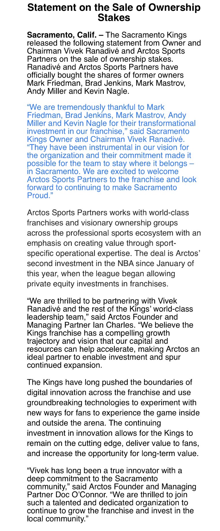 James Ham On Twitter Here Is The Official Statement From The Kings On Mastrov Jenkins Friedman Miller And Nagle Selling Ownership Stake To Arctos Sports Partners Https T Co Volksgd1n0 Twitter